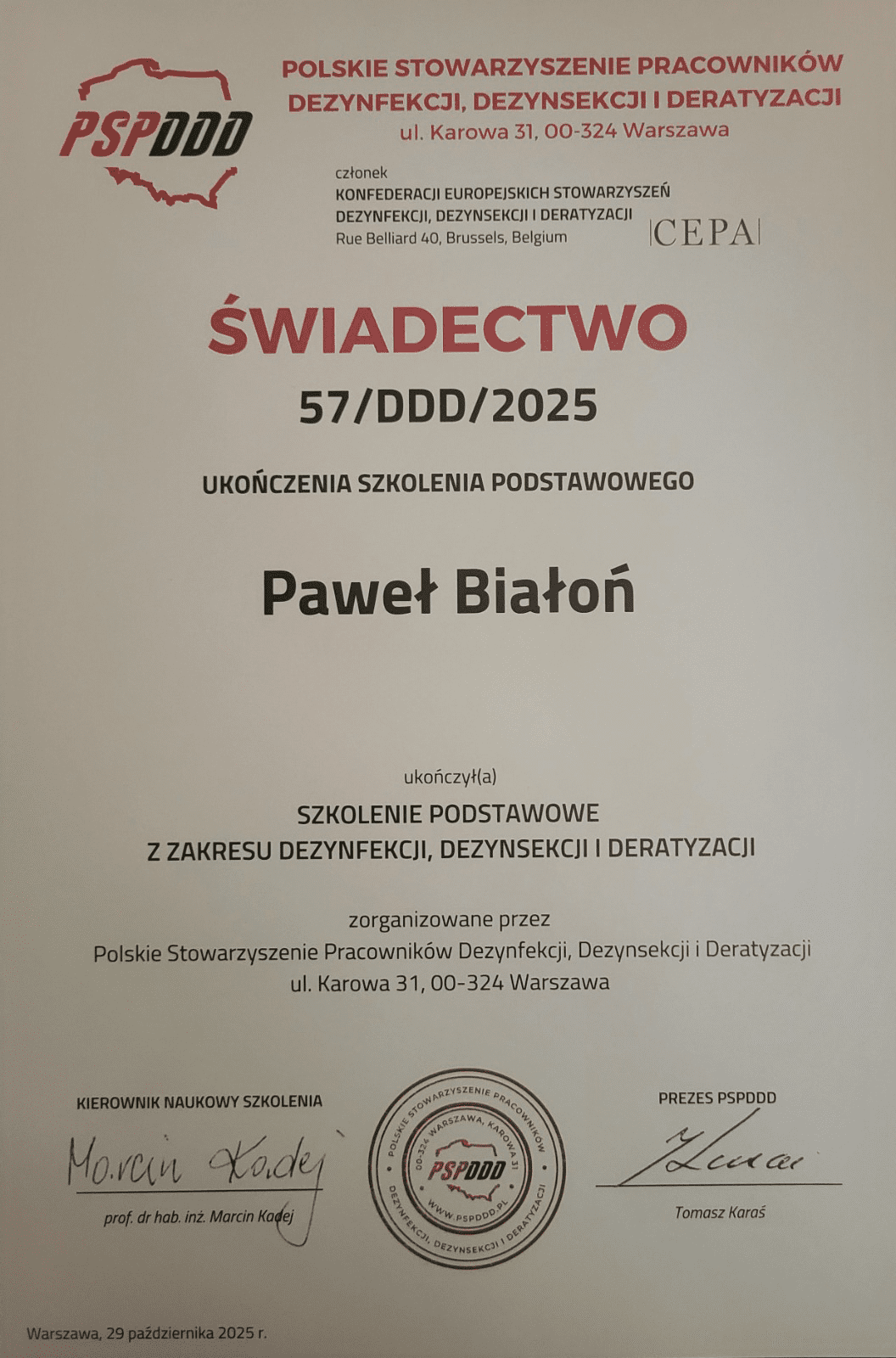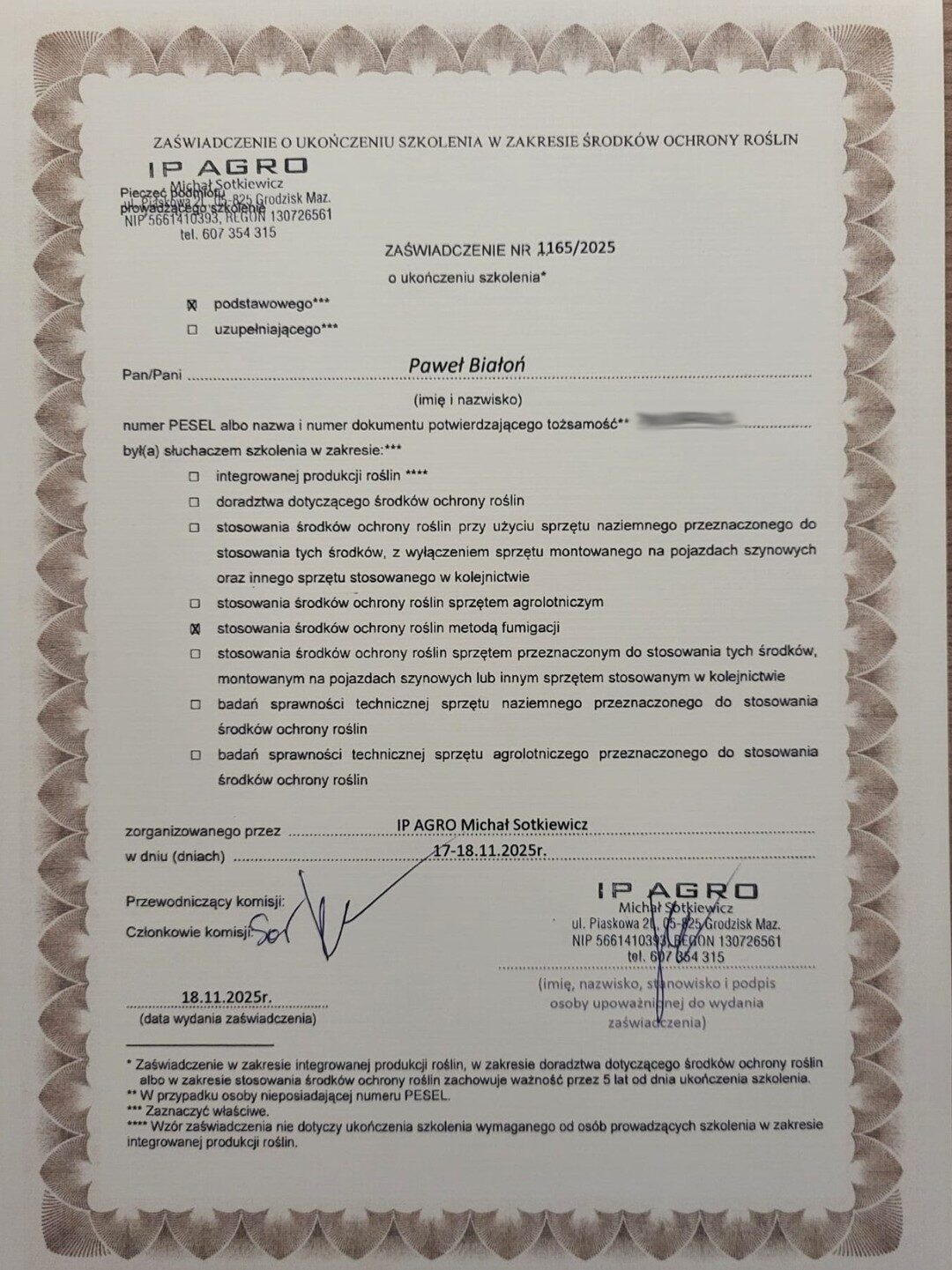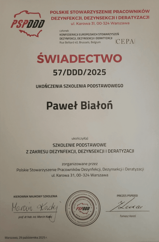 Posiadamy certyfikat ukończenia specjalistycznego szkolenia z zakresu środków ochrony roślin metodą fumigacji, który potwierdza nasze kwalifikacje i uprawnienia do bezpiecznego oraz zgodnego z prawem wykonywania zabiegów gazowania (fumigacji).
